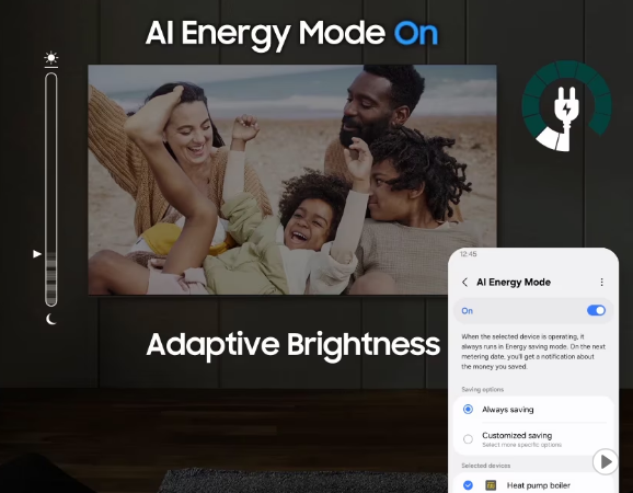 Easily reduce your power consumption by turning on Al Energy Mode. Your TV will auto - adjust its brightness based on the room's lighting and your user activity. It also subtly adjusts brightness during different scenes to save even more energy.