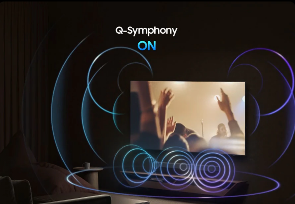Surround yourself with beautifully orchestrated sound. Samsung technology syncs the TV and soundbar audio to play simultaneously - without muting the speakers of either device.