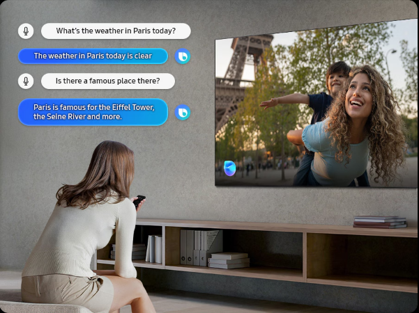 With updated intelligence, Bixby in your Samsung Al TV is the perfect center of your Al home. It can process multiple commands at once, and it's better at grasping the wider context. Enjoy smoother conversations, easier searches, more intuitive reactions and seamless device control.